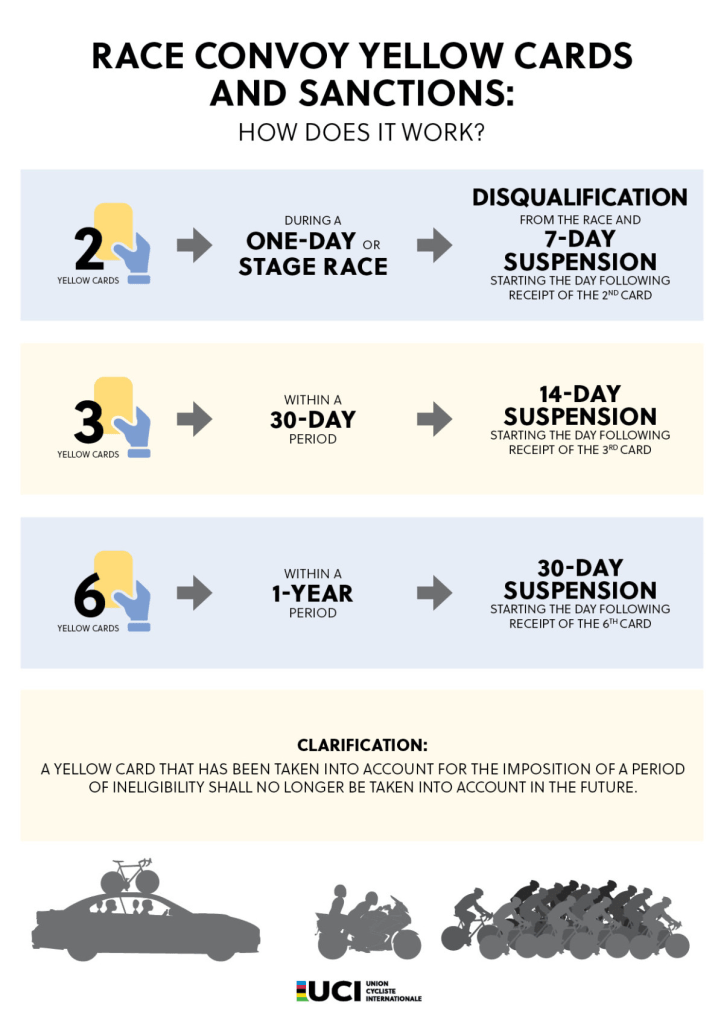 The yellow card system is designed to tackle unsafe or undesirable behaviours by providing a structured method of recording and penalising ‘race incidents’ within the meaning of Article 2.12.007 of the UCI Regulations. Unlike physical yellow cards shown on the field in other sports, infractions will be documented in race communiqués published after the finish. The new card system is intended to plug the gap where a relegation or disqualification might be inappropriate, and monitor undesirable behaviour over time.
